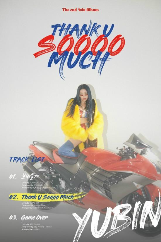 소속사 JYP엔터테인먼트는 21일 JYP 및 유빈의 각종 SNS 채널에 새 디지털 앨범 '#TUSM' 트랙리스트를 공개했다. 타이틀곡 'Thank U Soooo Much'를 비롯해 '보내줄게', 'Game Over'까지 총 3곡이 실렸다.