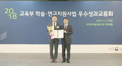 박종환 동아대 교수(왼쪽)가 지난 13일 서울 더케이호텔에서 열린 시상식에서 기념촬영을 하고 있다. 동아대학교 제공.동아대학교(총장 한석정)는 박종환 바이오헬스융합연구소 교수(의예과 겸직)가 2017 교육부 학술·연구지원사업 우수자로 선정돼 부총리 겸 교육부장관 표창을 받았다고 21일 밝혔다.