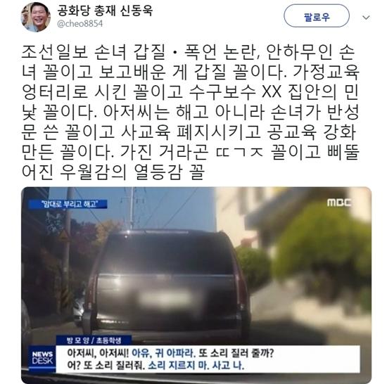 신 총재는 22일 자신의 트위터 계정에 "조선일보 손녀 갑질ㆍ폭언 논란, 안하무인 손녀 꼴이고 보고배운 게 갑질 꼴이다. 가정교육 엉터리로 시킨 꼴이고 수구보수 XX 집안의 민낯 꼴이다"는 내용의 글을 올렸다.