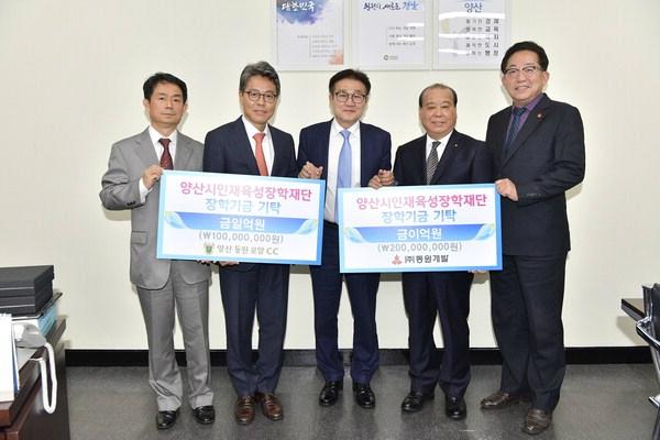 ㈜동원개발(회장 장복만)과 양산동원로얄CC가 양산지역 내 인재 육성에 써달라며 양산시장학재단에 각각 2억 원과 1억 원의 장학금을 기탁(사진)했다.