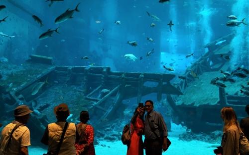 이어서 나오는 해저터널을 지나면 각종 해양 생물들을 볼 수 있는 크고 작은 수족관들이 나타난다. 마침 청소시간이어서 잠수복을 입은 직원들이 수족관 안에서 해수와 모래를 깔끔하게 정리하는 모습이 보인다. 초대형 수족관이 나타난다. 건너편에도 유리창이 보인다. 그곳은 호텔 객실이라고 한다. 호텔 숙박객이 방에서 수족관 풍경을 즐길 수 있는 것이다.