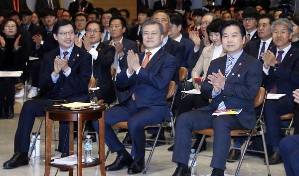 13일 경남도청에서 열린 '중소기업 스마트 제조혁신 전략 보고회'에 참석한 김경수 경남도지사, 문재인 대통령, 홍종학 중소벤처기업부 장관. 연합뉴스연말을 맞아 대통령부터 경제부처 장관에 이르기까지 부산·경남·울산(PK) 지역을 방문하는 횟수가 부쩍 늘고 있다. 특히 13일에는 대통령과 장관 2명이 동시다발적으로 PK를 방문했다.