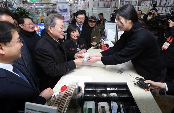 문재인 대통령이 13일 오후 경남 창원시 마산 창동예술촌을 방문, 1955년 창업한 개인서점으로 2대째 운영 중인 '학문당' 서점을 찾아 책을 사고 있다. 문 대통령은 <이선관 시 전집>과 허수경 작가의 <그대는 할 말을 어디에 두고 왔는가?>를 온누리상품권으로 구매했다. 연합뉴스김경수 경남도지사의 1호 공약인 서부경남 KTX(남부내륙 고속철도)가 정부의 예비타당성 조사 면제 사업으로 사실상 확정돼 조기 착공이 가능해졌다.