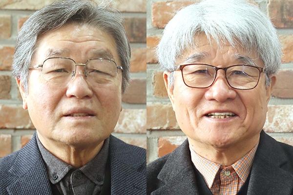 공재동(왼쪽), 배익천.700여 편의 작품 중에서 최종심에 오른 세 편의 작품, '인사' '북소리' '소원을 들어 드립니다'를 다시 한번 꼼꼼히 읽었다. '인사'는 동시 중에 뽑힌 유일한 작품이고, 나머지 두 편은 동화였다.