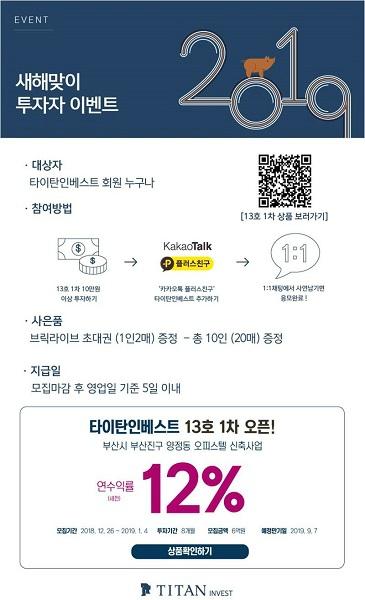 이벤트 참여 방법은 간단하다. 13호 1차 상품에 10만원 이상 투자한 경우 타이탄인베스트 카카오톡 플러스친구 1:1 채팅에 타이탄인베스트 아이디와 함께 사연을 남기면 응모가 완료된다. 상품 투자와 이벤트 관련 정보는 타이탄인베스트 홈페이지를 참고하면 된다.