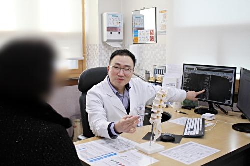 김성진 부산고려병원 척추센터 진료과장이 환자를 진료하고 있다. 부산고려병원 제공날씨가 추워지면 허리 근육과 인대가 긴장하게 되고 관절과 신경에 분포하는 말초혈관이 수축하여 요통이 잘 발생하게 된다. 특히 허리 협착증 등의 퇴행성 척추질환이 있는 환자에게 자주 발생한다.