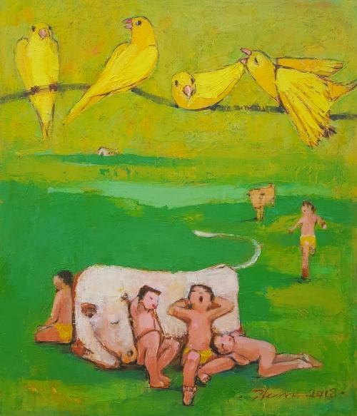 나이 일흔 일곱 노작가의 작품은 여전히 유년의 뜰에 머물러 있다. 전시장에 들어서면 원색의 노랑과 파랑에 휩싸이는 듯한 착각이 든다. 사물과 이웃을 사랑하는 마음이 가득하다. 그의 작품에 빠지지 않는 아이와 소, 개, 새들이 어울리는 풍경은 에덴동산과 다름없다.