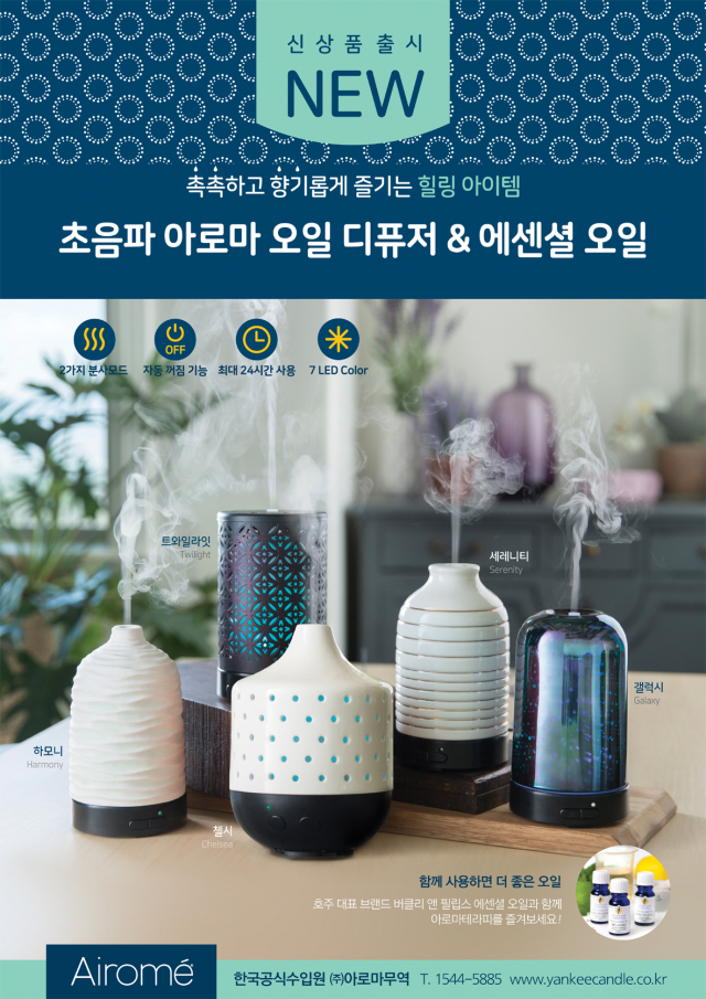 양키캔들 한국공식수입원 ㈜아로마무역은 향기를 전해주는 초음파 아로마 오일 디퓨저 5종을 선보인다고 12일 밝혔다.