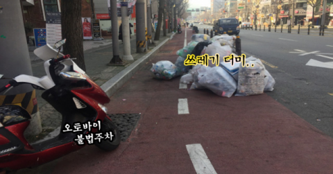 부산 남구 용호동 경성대 인근 자전거 전용도로가 불법 주차 오토바이와 쓰레기 더미 등으로 몸살을 앓고 있다.
