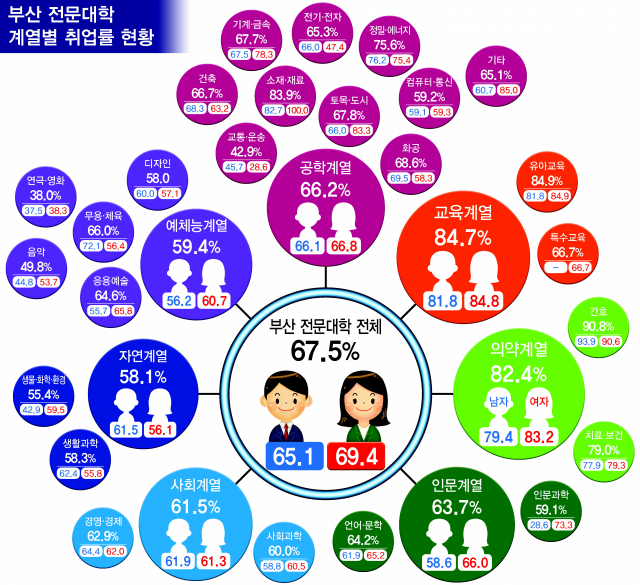 부산 전문대 취업률은 67.5%로 전국 평균(69.8%)보다 낮지만 하락폭은 0.5%P에 그쳤다. 계열별로는 전통의 강자인 유아교육과 간호, 치료·보건이 포함된 교육계열(84.7%)과 의약계열(82.4%)이 뒤를 이었다. 대학과 달리 관광외국어 전공을 둔 인문계열(63.7%)은 전년보다 11%P 올랐다. 전년 대비 상승폭을 보면 5.2%P 상승한 응용예술(64.6%)이 눈에 띈다. 미용계열 학과들이 속한다. 공대 화공(6.3%P), 소재·재료(5.4%P), 정밀·에너지(3.9% 포인트) 계열도 전년보다 상승했다.