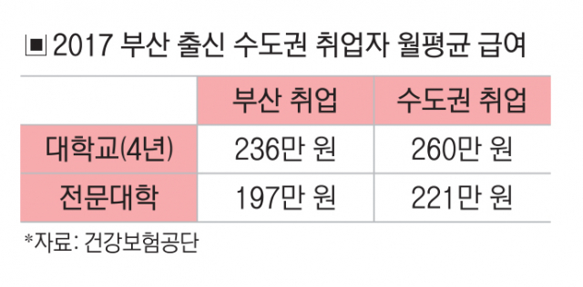 수도권 진출 시 부산에서 취업했을 때보다 월평균 급여도 높다. 부산의 4년제 대학을 나와 수도권에 취업을 했을 경우 월평균 급여가 260만 원에 달해 부산에 취업했을 경우 받는 평균 급여(236만 원)보다 24만 원이 많다. 전문대 졸업자의 경우도 수도권 취업자는 월평균 221만 원을 받아 부산 취업자 초임(197만 원)보다 24만 원 많이 받는다.