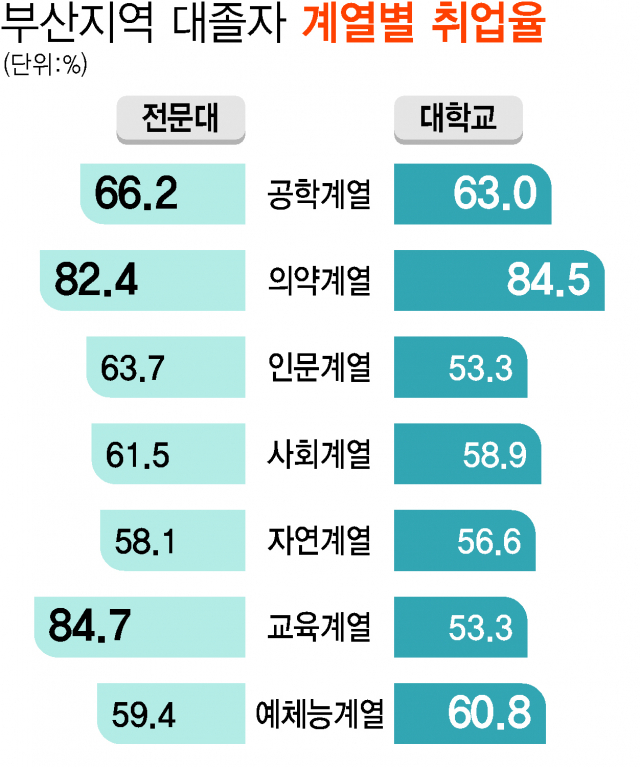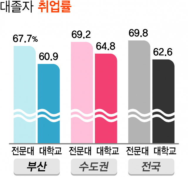부산 전문대 졸업생들의 취업률은 67.7%였는데, 역시 수도권(69.2%)이나 전국 평균(69.8%)에 미치지 못했다.