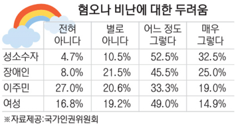 2017년 국가인권위원회가 발표한 ‘혐오표현 실태조사 및 규제방안 연구’에 따르면 소수자들 대상 조사에서, 혐오나 비난이 두려우냐는 질문에 성소수자는 85%가 ‘매우 그렇다’와 ‘그렇다’고 답했다. 장애인은 70%, 이주민은 52%였다. 범죄에 대한 두려움도 93%로 가장 컸다. 온·오프라인에서 혐오표현 경험 여부도 성소수자는 각각 98%, 92%로 가장 높았다. 대부분 항목에서 성소수자에 대한 혐오 정도가 가장 잔인하고 빈번한 것으로 조사됐다.