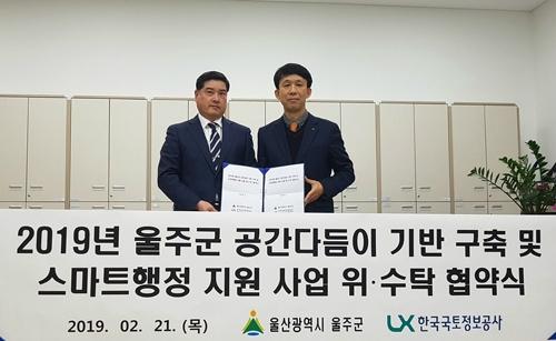 박석환 LX공사 부산울산지역본부 국토정보사업처장(오른쪽)과 한기권 울주군청 민원지적과장(왼쪽)이 업무 협약 체결 후 기념촬영을 하고 있다. 한국국토정보공사 제공.한국국토정보공사(LX) 부산울산지역본부(본부장 여원찬)는 21일 울산광역시 울주군청(군수 이선호)과 '공간다듬이 기반 구축 및 스마트 행정지원 사업' 위ㆍ수탁 협약을 체결했다.