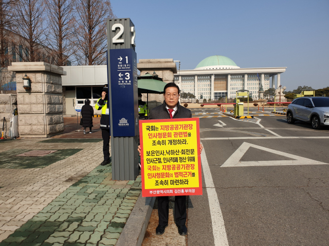 김진홍 부산시의회 부의장이 21일 서울 여의도 국회의사당 앞에서 지방공공기관장에 대한 인사청문회의 법제화를 촉구하면서 1인 피켓시위를 벌이고 있다. 박석호 기자 psh21@