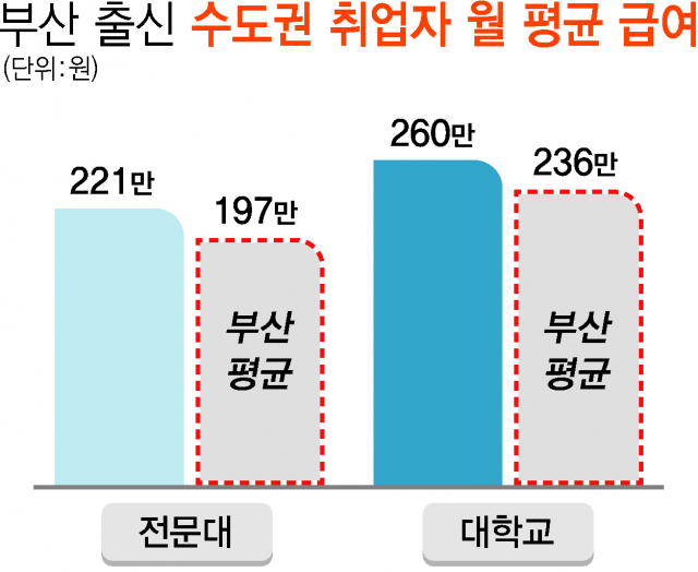 수도권 진출 시 부산에서 취업했을 때보다 월평균 급여도 높다. 부산의 4년제 대학을 나와 수도권에 취업을 했을 경우 월평균 급여가 260만 원에 달해 부산에 취업했을 경우 받는 평균 급여(236만 원)보다 24만 원이 많다. 전문대 졸업자의 경우도 수도권 취업자는 월평균 221만 원을 받아 부산 취업자 초임(197만 원)보다 24만 원 많이 받는다.