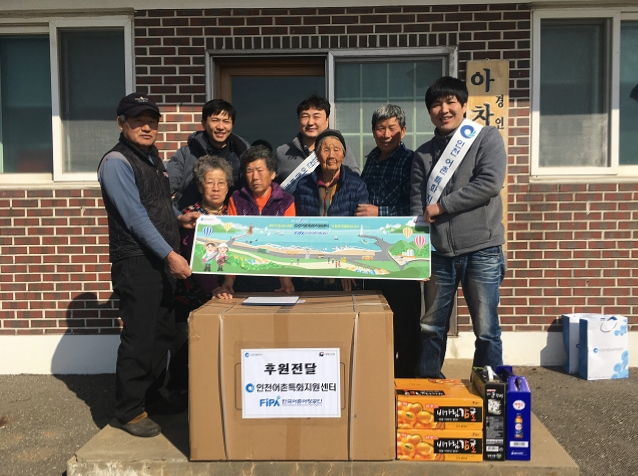 한국어촌어항공단 소속 인천어촌특화지원센터(센터장 김종범)는 지난 23일 인천시 강화군 최북단에 위치하여 태극기 마을로 유명한 아차도마을(어촌계장 최재석)에 위로방문해 100만 원 상당의 안마의자를 후원하는 등 사회공헌을 펼쳤다고 밝혔다.(사진)