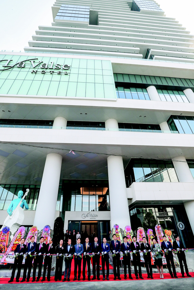 최근 관광명소로 급부상하고 있는 부산 영도구에 29층 규모에 389개 객실을 갖춘 라발스호텔이 28일 영업을 시작했다. 이날 개관식에 참석한 내빈들이 테이프 커팅을 하고 있다. 이재찬 기자 chan@