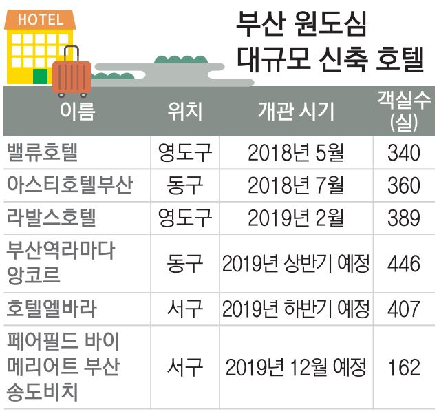 그러나 부산을 찾는 관광객이 지금보다 늘지 않는 이상 한정된 수요를 놓고 호텔 업계가 경쟁할 수밖에 없어 출혈 경쟁 등이 심해질 가능성도 있다. 원도심의 한 호텔 관계자는 “실제로 해운대의 경우 비즈니스 호텔 한 곳이 매물로 나오는 등 객실 공급 과잉 후폭풍이 시작됐다”며 “상대적으로 원도심의 경우 관광객은 늘고 있는 데 비해 객실 공급은 많지 않은 편이지만, 외국인 관광객 수가 계속 답보하고 강릉 등 국내 경쟁 도시에도 밀린다면 향후 부산 시장 전망이 밝지만은 않다”고 우려했다.
