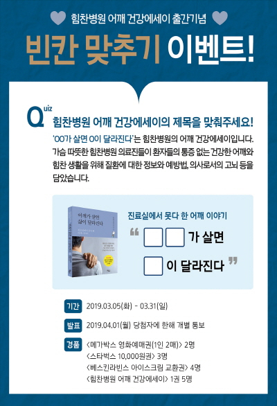 힘찬병원(대표원장 이수찬)이 어깨건강 에세이 '어깨가 살면 삶이 달라진다' 출간 기념으로 3월 5일부터 31일까지 ‘빈칸 맞추기 온라인 이벤트’를 진행한다고 밝혔다.