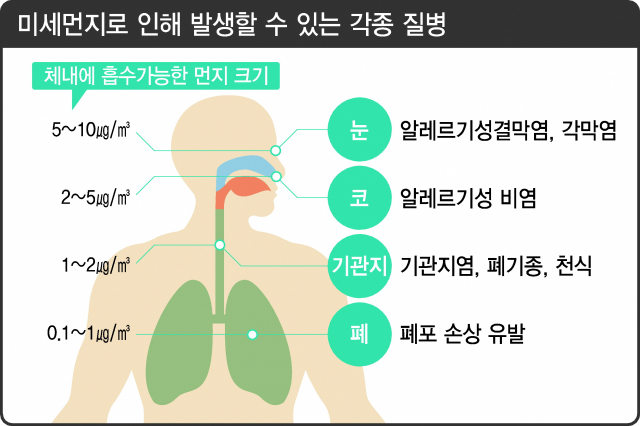 미세먼지는 기관지를 훼손하고 초미세먼지의 경우 폐 깊숙이 침투해 회복이 어려운 폐포를 파손하고, 혈관까지 침투해 몸 안을 돌아다니며 이곳저곳을 아프게 할 수 있다. 두통, 아토피 등의 원인으로 지목되고 임산부의 경우 저체중아 출산과 유산 위험을 증가시킨다는 보고도 나왔다. WHO는 초미세먼지를 1급 발암물질로 분류하고 있다.