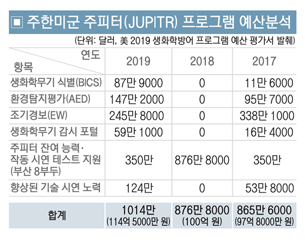 본보가 단독 입수한 미 국방부의 ‘2019 회계연도(2018년 10월~2019년 9월) 생화학방어 프로그램 예산 평가서’를 보면 미국은 주피터 프로젝트에 △2019년 1014만 달러 △2018년 876만 8000달러 △2017년 865만 6000달러의 예산을 지출했다. 또 ‘2018년 회계연도(2017년 10월~2018년 9월) 생화학방어 프로그램 예산 평가서’를 보면 2016년에 주피터 예산으로 2751만 8000달러를 마련했는데, 모두 합치면 4년간 적어도 5000만 달러 이상을 쏟아부은 셈이다. 이는 2016년부터 8부두에서 주피터 프로젝트가 단 한 해도 중단없이 계속 진행됐음을 보여주는 것이기도 하다.