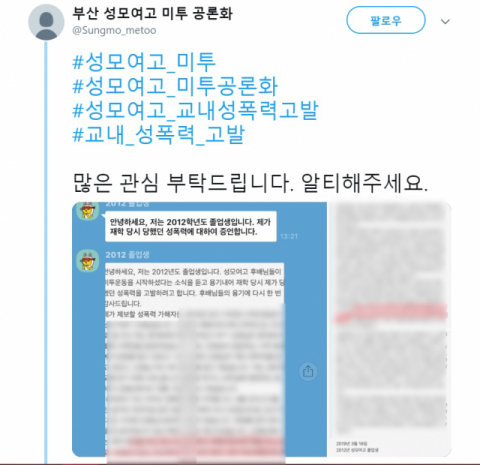 트위터와 인스타그램 등 SNS에는 성모여고 교직원들의 성폭력 사례를 제보하는 글이 이어지고 있다.