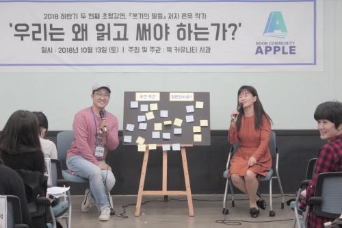 ‘북 커뮤니티 사과’는 저자 초청 강연도 활발하게 진행하고 있다. 지난해 열린 <쓰기의 말들> 은유 작가와의 만남. 사진=‘북 커뮤니티 사과’ 제공·강선배 기자 ksun@지난달 서울 지역 독서 모임 스타트업 ‘트레바리’가 50억 원 규모의 투자를 받아 화제가 됐다. 4개월에 19만~29만 원의 회비를 내는 프리미엄 독서 모임으로 평소 만나기 힘든 명사와 함께 책을 통해 교류할 수 있고, 참석자가 인맥을 구축할 수 있도록 장(場)을 만든 점이 성공비결로 꼽힌다. ‘트레바리’처럼 프리미엄 모델은 아니지만, 부산에도 10년째 독서 모임을 운영하는 기획자가 있다. ‘북 커뮤니티 사과’ 강동훈(32) 총괄 운영자다.