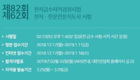 대한검정회는 오늘(25일) 오전 제82회 한자급수자격검정시험, 제62회 한자 한문전문지도사 시험 합격자를 발표했다. 이로 인해 대한검정회 홈페이지 접속이 원활하지 않다.