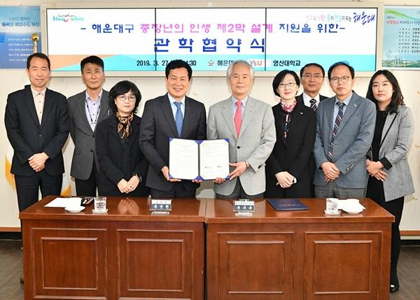 와이즈유가 27일 해운대구청과 평생교육 프로그램 운영 관학협약을 체결했다. 영산대학교 제공.와이즈유(영산대학교, 총장 부구욱)는 27일 해운대구청(구청장 홍순헌)과 '해운대구 중장년의 인생 제2막 설계지원'을 위한 관학협정을 체결했다.