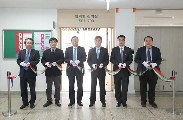 동아대는 지난 28일 오전 한 총장과 김동규 교학부총장, 이재열 산학부총장, 조규판 교육혁신원장, 이상진 건설관리본부장 등 대학본부 관계자 20여 명이 참석한 가운데 승학캠퍼스 인문과학대학 7층에서 '협력형 강의실' 개소식을 가졌다.