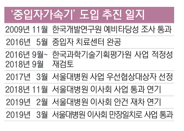 31일 서울대병원 등에 따르면 의료용 중입자 가속기 도입 사업이 지난달 29일 서울대병원 이사회를 통과했다. 앞서 지난해 11월과 2월 두 차례 열린 이사회에서 분담금 조정 문제 등으로 연기된 이후 세 번 시도 끝에 이뤄낸 결과다. 서울대병원 측은 “이견 없이 9명 만장일치로 통과했다”면서 “서울대병원이 주관 사업자로 확정됐다는 의미”라고 밝혔다. 부산시 등에 따르면 2606억 원 총사업비 중 750억 원을 제외한 나머지 사업비를 지자체(660억 원)와 정부(1196억 원)가 낸다. 750억 원을 비롯해 운영 적자 등은 병원이 책임진다.