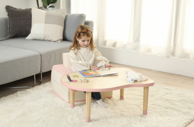 와이드 테이블은 나무 소재로 제작해 안전성이 높은 유아용 테이블이다. 테이블의 높낮이는 2단계로 조절할 수 있어 성장 속도에 맞춰 아이가 오랜 기간 바른 자세를 유지할 수 있도록 돕는다. 사이즈가 넓고 양쪽으로 마주보기 좋은 디자인으로 형제자매가 함께 사용하거나 부모님과 함께 홈스쿨링을 하기에도 적합하다.