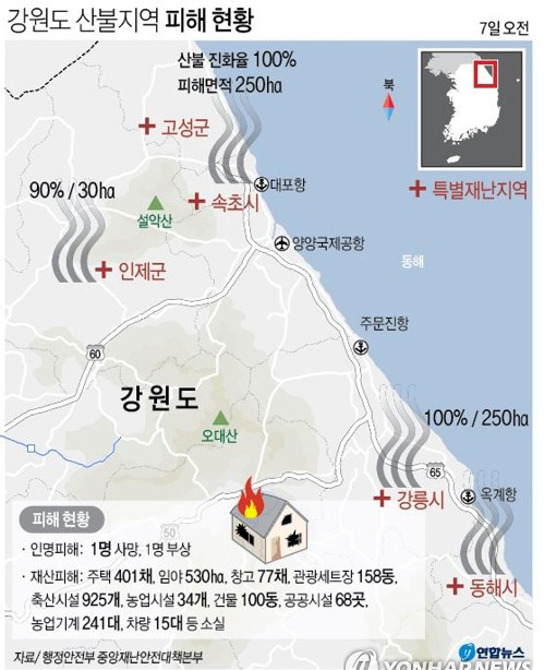 지난 6일 문재인 대통령은 강원도 고성군·속초시·강릉시·동해시·인제군 등 5개 시·군을 특별재난지역으로 선포해 달라는 건의를 재가했다. 특별재난지역이 선포되면 피해주민 구호, 주거용 건축물 복구, 농·임·어업 등 생계수단 시설 복구, 공공시설 복구 등에 지원이 이뤄진다. 농·임·어업인 자금 융자와 상환기한 연기, 세입자 보조, 고등학생 학자금 면제뿐만 아니라 국세, 지방세, 등의 지원도 가능하다.