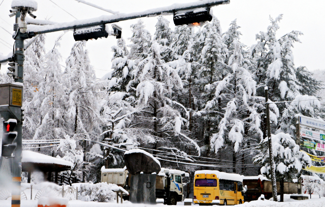 10일 강원 태백시 상장동 횡단보도에 빨간불이 커져 있다. 태백지역에는 이날 오전 7시 현재 22.5㎝의 눈이 내렸다. [사진=연합뉴스]