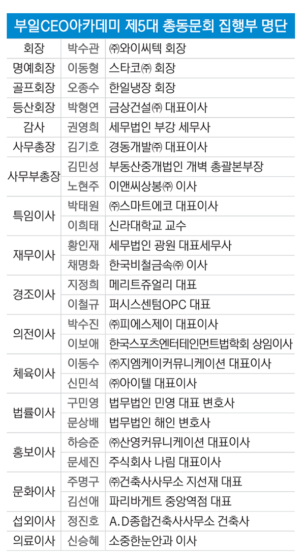 2015년 4월 출범해 올해로 5년째를 맞이한 부일CEO아카데미 총동문회는 부산·울산·경남 지역 각계각층 오피니언리더들의 최고 교류와 배움의 장으로 굳건하게 자리매김했다. 2016년부터 제2·3·4대 총동문회장을 맡아 부일CEO아카데미 총동문회를 이끌어온 박수관 ㈜와이씨텍 회장은 올해도 총동문회장직을 수락해 원우 간 화합을 이끌기로 했다. 박수관 회장은 온화한 리더십과 끈끈한 정을 토대로 각 기수·동문회별 네트워크 강화에 힘을 기울여 부일CEO아카데미가 명실상부 전국 최고의 아카데미로 거듭나는 데 큰 역할을 하고 있다.