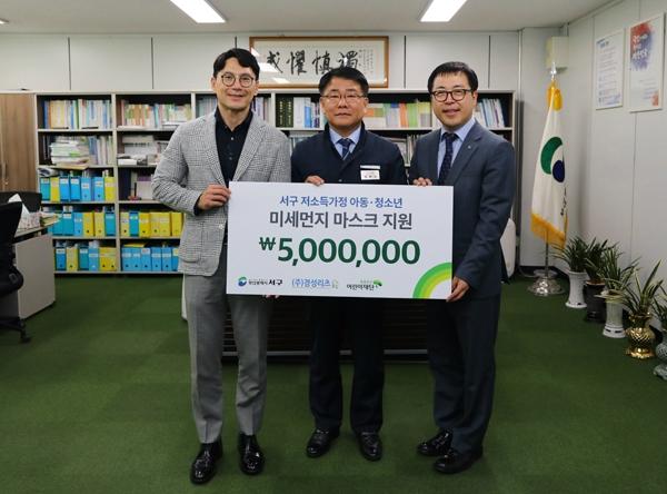 ㈜경성리츠와 초록우산어린이재단은 지난 17일 부산 서구(구청장 공한수)저소득가정 아동ㆍ청소년 100여 세대에 500만 원 상당의 미세먼지 마스크를 지원하였다. 디지털본부 news@busan.com