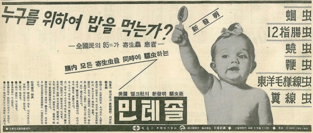 "국민의 95%가 기생충 환자"라는 경각심을 자극한 구충제 민테졸 광고. 1965년 6월 5일 자 부산일보 1면.