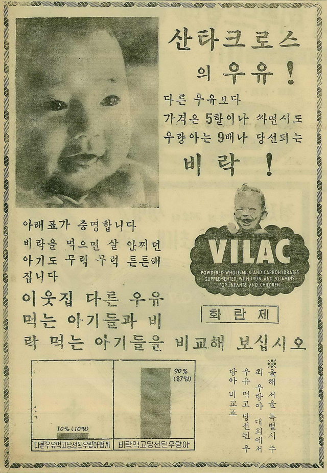 1959년 4월 4일 자 부산일보 3면에 듀멕쓰 분유가 “감옥이 없는 정말국(丁抹國·덴마크) 제품”이라는 광고를 냈다. 감옥과 분유의 상관관계를 딱히 찾긴 어렵지만, 굳이 해석하면 그만큼 좋은 환경에서 만든 제품임을 강조한 의도로 읽힌다. 한국전쟁 이후 미국의 구호물자로 들어온 뒤 분유는 엄마 젖보다 월등히 좋은 마법의 가루로 자리 잡았다. 1961년 모리나가 유업의 우두표 분유는 “모유를 능가하는 풍부한 영양가!”라는 광고 카피 아래 “귀아의 체중을 배로 늘려준다”고 선전했고, 1959년 비락(1963년 설립해 현재 부산에 본사를 둔 ㈜비락과는 무관한 듯)은 “모유보다 영양가가 많다”는 걸 장점으로 내세웠다.