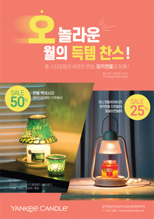 양키캔들이 5월 가정의 달을 맞아 다양한 할인이벤트를 진행한다. 양키캔들 한국공식수입원 ㈜아로마무역은 양키캔들의 대표 상품인 '자캔들(S)', '텀블러', '미니캔들워머' 전 상품을 25% 할인하고 캔들 액세서리인 '쉐이드&트레이' 모자이크 시리즈를 최대 50% 할인하는 행사(사진)를 진행한다고 2일 밝혔다.