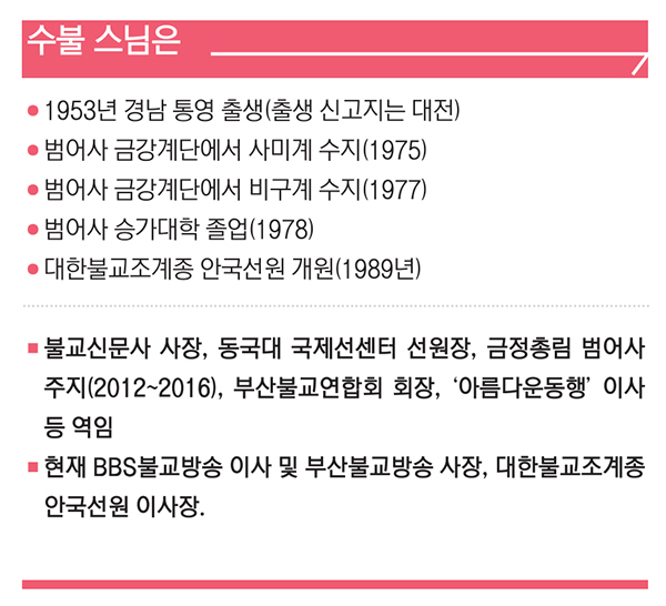 출가 동기를 말해 달라는 요청에 수불 스님은 “인과 때문인지 필연적으로 절에 들어가지 않으면 안 되는 상황이 되더라. 그런데 범어사에 들어오고 보니 마치 전생의 내 집에 온 것처럼 편안하고 공부가 잘 되더라”라고 회고했다.