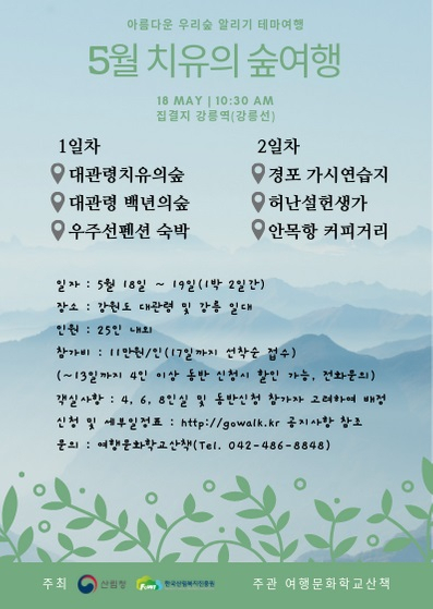 참가자들은 오는 18일부터 19일까지 1박 2일간 국립대관령치유의숲, 대관령자연휴양림, 경포습지 생태공원 등을 탐방하고 명상과 숲해설 등을 체험한다. 특히 이번 숲여행은 강원도 산불피해지역의 관광경기 회복에 기여하기 위해 기획됐으며 지역경제에 도움을 주기 위해 모든 일정에서 지역의 숙소와 음식점 등을 이용할 계획이다.