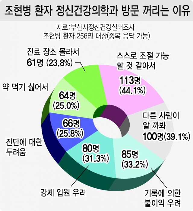 부산시와 동아대 산학협력단이 함께 조사한 부산시정신건강실태조사 및 제2기 정신건강 5개년 기본계획에 따르면 조현병 환자의 39.1%가 발병 사실이 드러날까 우려해 정신건강의학과 방문을 망설이는 것으로 나타났다. 지난해 6월부터 12월까지 진행된 이번 조사는 부산 소재 병원에 입원했거나 외래 진료를 받는 조현병 환자 256명을 대상으로 이뤄졌다.