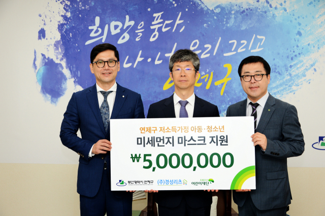 연제구(구청장 이성문)는 28일 ㈜경성리츠(대표 채창일)로부터 지역 내 저소득 어린이들의 건강보호를 위한 미세먼지 마스크(500만 원 상당)를 전달 받았다.