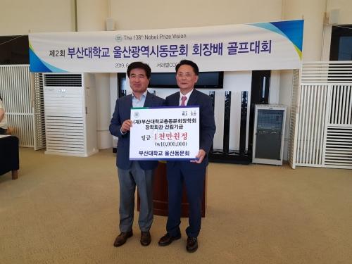 부산대 울산동문회와 현대자동차 울산공장 효원동문회는 지난 2일 경주 서라벌CC에서 열린 부산대학교 울산시동문회 회장배 골프대회에서 박종호 부산대총동문회장에게 각각 1000만 원씩 전달(사진)했다.