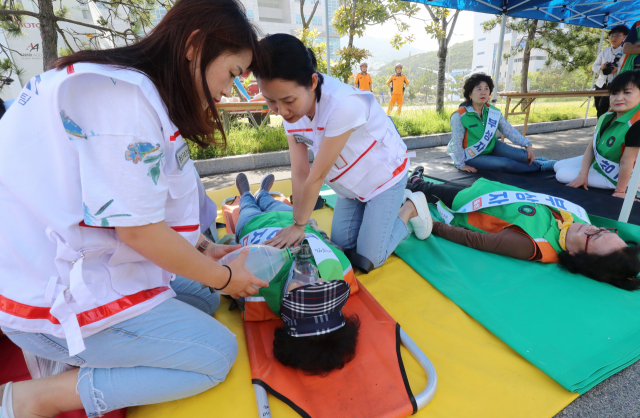13일 부산 영도구 국제크루즈터미널에서 열린 ‘2019 재난대응 안전부산훈련’에서 영도보건소 응급의료팀이 태풍으로 인한 집중호우와 강풍 상황을 가상해 부상자들을 치료하고 있다. 김경현 기자 view@