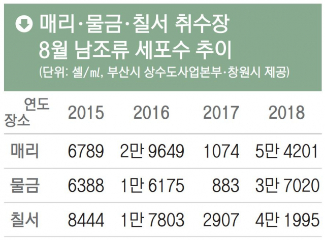 16일 본보가 부산시 상수도사업본부와 창원시에 취·정수장 수질 관련 정보공개를 청구한 결과에 따르면 지난해 8월 매리취수장의 남조류 세포수는 5만 4201셀/㎖로 기록됐다. 이는 매리취수장에서 2015년 남조류 세포수를 관측하기 시작한 이래 가장 높은 수치로, 그해 8월 6789셀/㎖에 견줘 8배 가까이 폭증했다. 조류 농도를 의미하는 클로로필-a 역시 지난해 8월 매리취수장은 50.0㎍/ℓ로 2006년 14.9㎍/ℓ 이래 최고치였다.