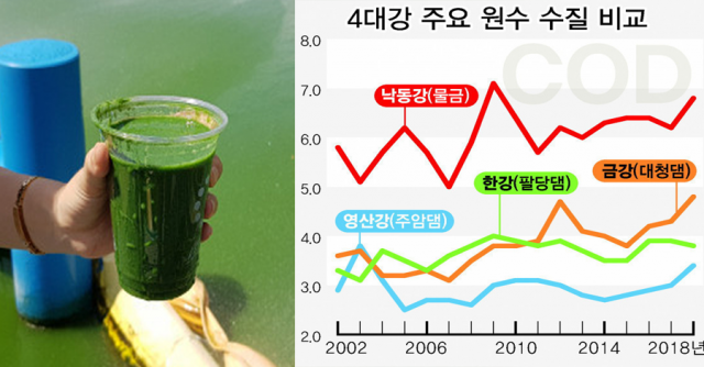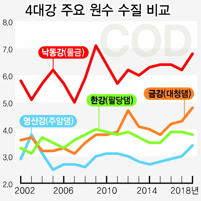 16일 환경부 물환경정보시스템에 따르면 지난해 부산의 취수장이 있는 물금의 낙동강 물 화학적산소요구량(COD)은 6.8㎎/L로 2009년 7.1㎎/L을 기록한 이후 최악을 기록했다. 전문가들은 이 정도 수질을 공업용수 또는 농업용수로 간주한다.