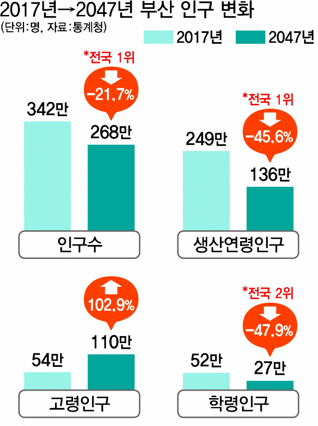 27일 통계청이 발표한 ‘2017~2047년 장래인구특별추계’에 따르면 2017년 5136만 명이던 전국 총인구는 30년 뒤인 2047년에는 4891만 명으로 245만 명이 감소할 전망이다. 부산만 따로 떼놓고 보면, 부산 인구는 342만 명에서 268만 명으로 감소하고 특히 생산연령인구(15~64세)는 249만 명에서 136만 명으로 줄어들게 된다. 이 기간에 인구감소율은 21.7%로 전국 17개 시·도 중에서 가장 높으며 전국 평균(-4.8%)에 비해서도 압도적으로 높다. 생산연령인구는 45.6%나 감소하는데 이 역시 전국 1위다. 저출산 현상과 더불어 수도권 인구 집중이 더해진 결과다. 반면 이 기간 수도권 인구는 0.9% 감소에 그친다.