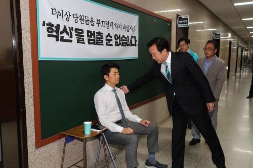 바른미래당 손학규 대표가 15일 오전 국회에서 열린 최고위원회의에 참석하기 위해 회의실로 들어가며 당 혁신 요구 단식농성을 하고 있는 권성주 혁신위원을 격려하고 있다. 김종호 기자 kimjh@바른미래당 부산 수영구 지역위원장인 권성주 혁신위원이 지난 12일부터 혁신위 정상화를 요구하며 무기한 단식 농성에 돌입했다. 권 위원은 2007년 대선 당시 이회창 후보의 출마를 반대하며 단식을 벌였던 권철현 전 의원의 아들이라는 점에서 이번 단식이 더욱 주목된다.